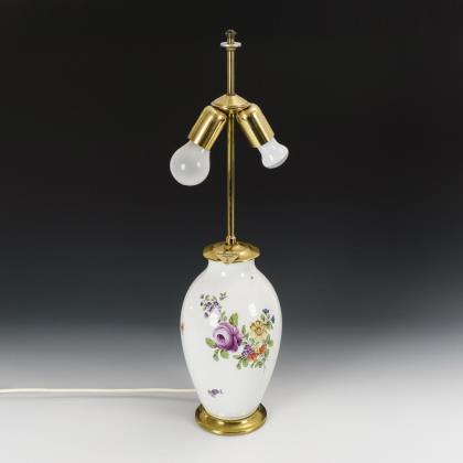 Konischer Schirm mit vier Lithophaniebildern mit Genreszenen. Auf mehrfach gegliedertem, teils durchbrochenem, rocaillereliefiertem Schaft. Elektrifiziert (funktionstüchtig)