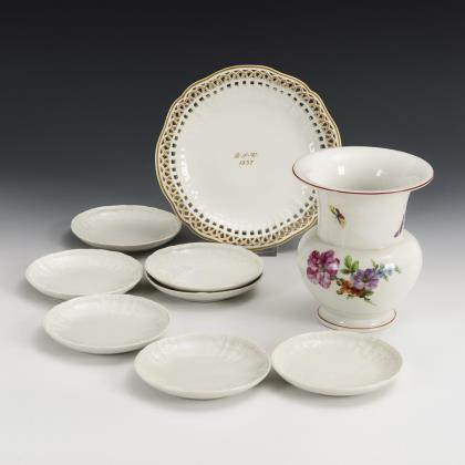 Vase mit Blumen- und Insektenmalerei (H 15 cm). / 7 weiße Tellerchen "Antikzierat" (Ø 11,5 cm). / 1 Durchbruchschale "Englischglatt" mit Goldstaffage (Ø 19 cm)