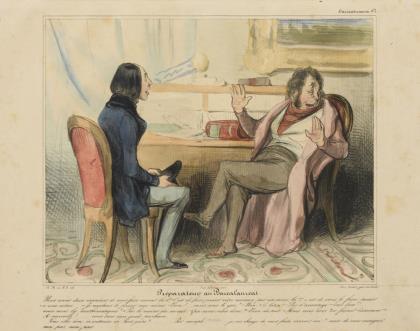 2 humorvoll dargestellte Herren an einem Tisch sitzend und im Gespräch, Begleittext als Dialog in französischer Sprache