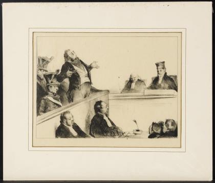 Humorvolle Darstellung anwesender Personen in einem Gerichtssaal