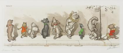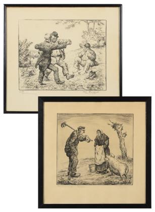 "Der kl. Bocker", Platte: 10 x 7 cm, verglast und gerahmt: 20 x 15,5 cm | "Zwei gegen Einen", Platte: 10,5 x 13 cm, verglast und gerahmt: 22 x 21,5 cm, Exemplar: XV/XXX, Passepartout mit Wasserflecken | "Herr Drubbelpinke", Platte: 16 x 12,5 cm, verglast und gerahmt: 26,5 x 21 cm, Exemplar: XXIII/XXV | "Das Finkentier", Platte: 18 x 14 cm, verglast und gerahmt: 33 x 28 cm, Künstlerdruck