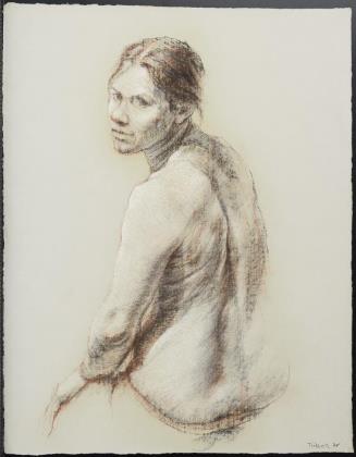 Ästhetische Zeichnung eines weiblichen Aktes, der sich selbst über die linke Schulter blickt