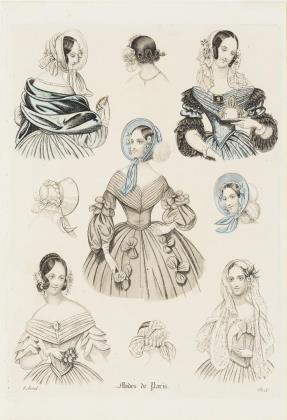 2 Darstellungen mit Damenhüten, aus: "Modes de Paris", 1840, Blatt: je 20 x 14 cm, im Passepartout: je 34 x 27 cm und 3 Darstellungen von Damenbekleidung von Adrien Dembour (1799 - 1877): "Costume de bal. 1803", "Capote anglaise. 1804" und "Costume de présentation. 1814", je um 1840, Blatt: je 31 x 23,5 cm, im Passepartout: je 47 x 37 cm, teils stockfleckig und geknickt