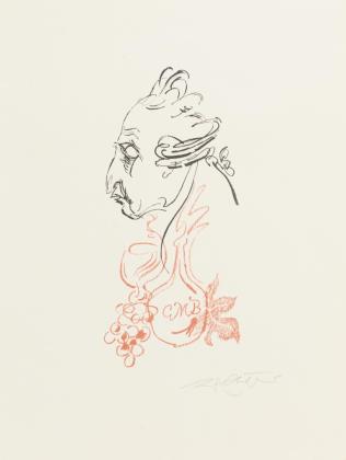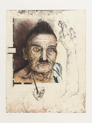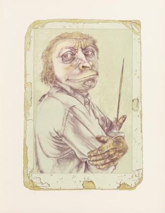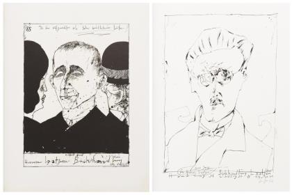 "Selbst als malender Affe", Blatt: 66 x 50,5 cm, Exemplar: 26/100, [19]76 | "Selbst, äffisch", Blatt: 65 x 50,5 cm, Exemplar: 44/80, [19]76 | "Der Schatten der Sonnenuhr", Blatt: 66 x 50,5 cm, Exemplar: 21/100, [19]72 | "Selbstbildnis (hündisch)", Blatt: 59 x 42,5 cm, Exemplar: 72/100, [19]69 | "Bildnis Fräul. Chr. Kannin Bläulich", Blatt: 47 x 41,5 cm, im Passepartout: 50,5 x 65 cm, Probedruck, [19]62