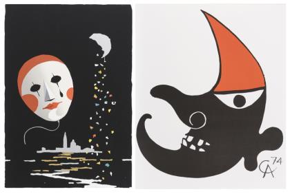 Calder, Alexander (1898 Lawnton - 1976 New York City): Mondgesicht, Farbsiebdruck, im Druck monogrammiert, Blatt: 68 x 56,5 cm, [19]74, Ecken links etwas geknickt | Undeutlich signiert (italienischer Künstler?): Kopf des Pierrot, Farbsiebdruck, Bleistiftsignatur, Blatt: 69,5 x 48 cm, Exemplar: 48/80, mit leichten Kratzspuren und minimal bestoßenen Ecken