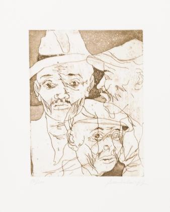 "Schwellkörperkopf IX/94", Blatt: 53,5 x 39 cm, Exemplar: 72/99, [19]94 | "Für Erich Mühsam zum 50. Todestag", Platte: 47 x 35 cm, Blatt: 53,5 x 39 cm, Exemplar: B 4/6, datiert: XI/84 | "E. Mühsam zum 50. Todestag", Platte: 48,5 x 34,5 cm, Blatt: 53,5 x 39,5 cm, Exemplar: 1 von 2 Unikatdrucken, datiert: I/85