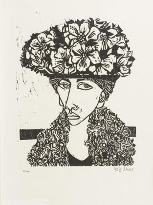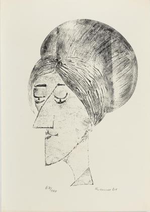 Damenporträt: Linolschnitt, Blatt: 61,5 x 43 cm, Exemplar: 67/100, [19]61, minimal geknickt | "Kopf": Linolschnitt, verso Titel-Stempel, Prägestempel "Schoeller Durex", Platte: 32 x 18,5 cm, Blatt: 62,5 x 44 cm, Exemplar: 97/100, [19]60, am Rand mit kleinen Knicken