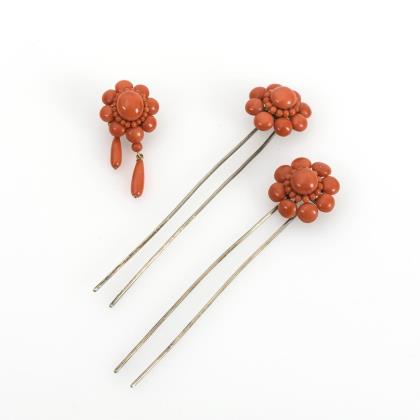 2 Haarnadeln und Brosche mit Korallen, um 1900