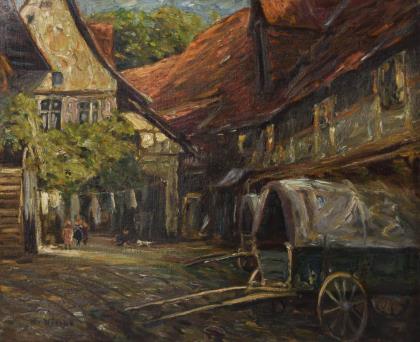 Pferdewagen vor den alten Häusern, die heute leider zum Kriegsverlust gehören