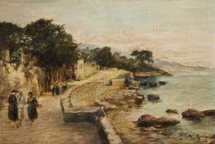 Staffagefiguren vor Turmruine mit Blick übers Meer bei Menton.