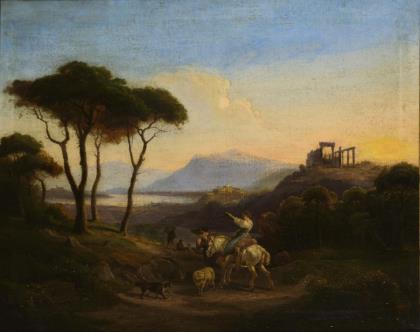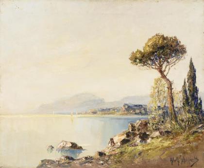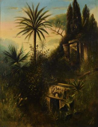 Impressionistisch angelegte mediterrane Landschaft. Profilierter Stuckrahmen