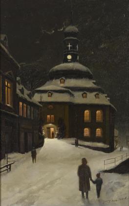 Personen auf verschneiten Straßen in Richtung Kirche unter dunklem Himmel