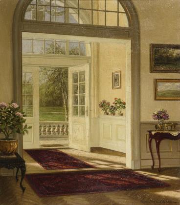Herrschaftliches Landhausinterieur mit zum Garten geöffneter Tür und einfallendem Sonnenschein