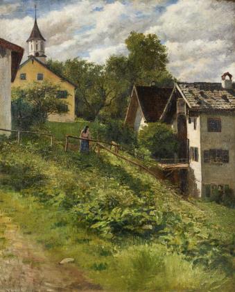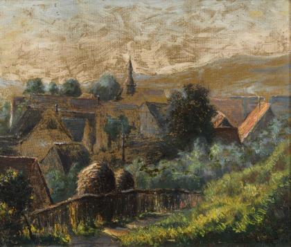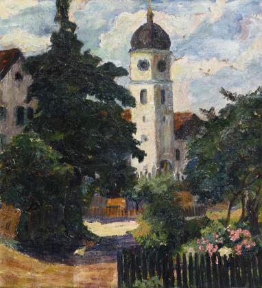 Expressiv und farbkräftig gemalte Ansicht des Ortes und der Kirche