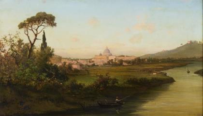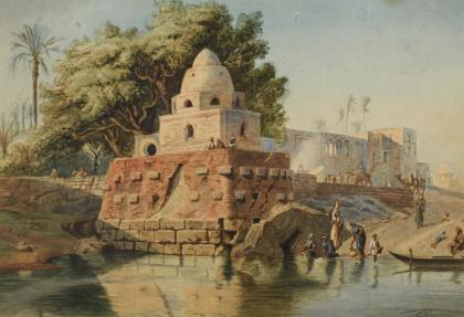 Orientmaler: Tempelanlage am Nilufer mit Staffage