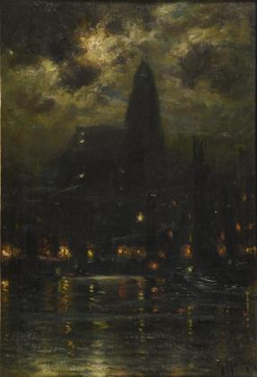 Blick vom Hafengelände mit den vielen Lichtern zum Dom unter hellem Mondlicht