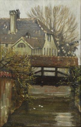 Blick über den Kanal zur überdachten Brücke mit dem Haus dahinter