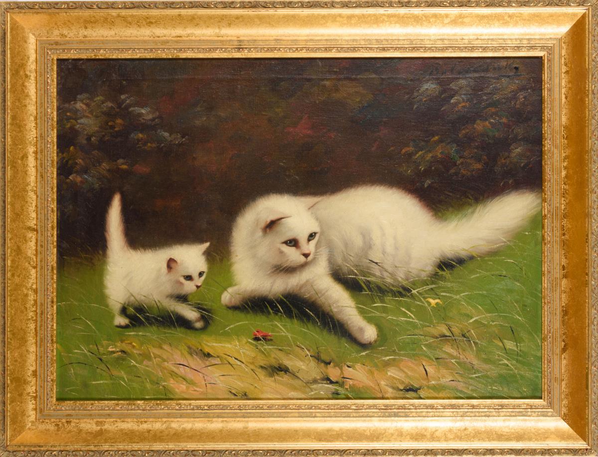 verso auf Keilrahmen bezeichnet. Zwei weiße Katzen beim Spielen im hohen Gras