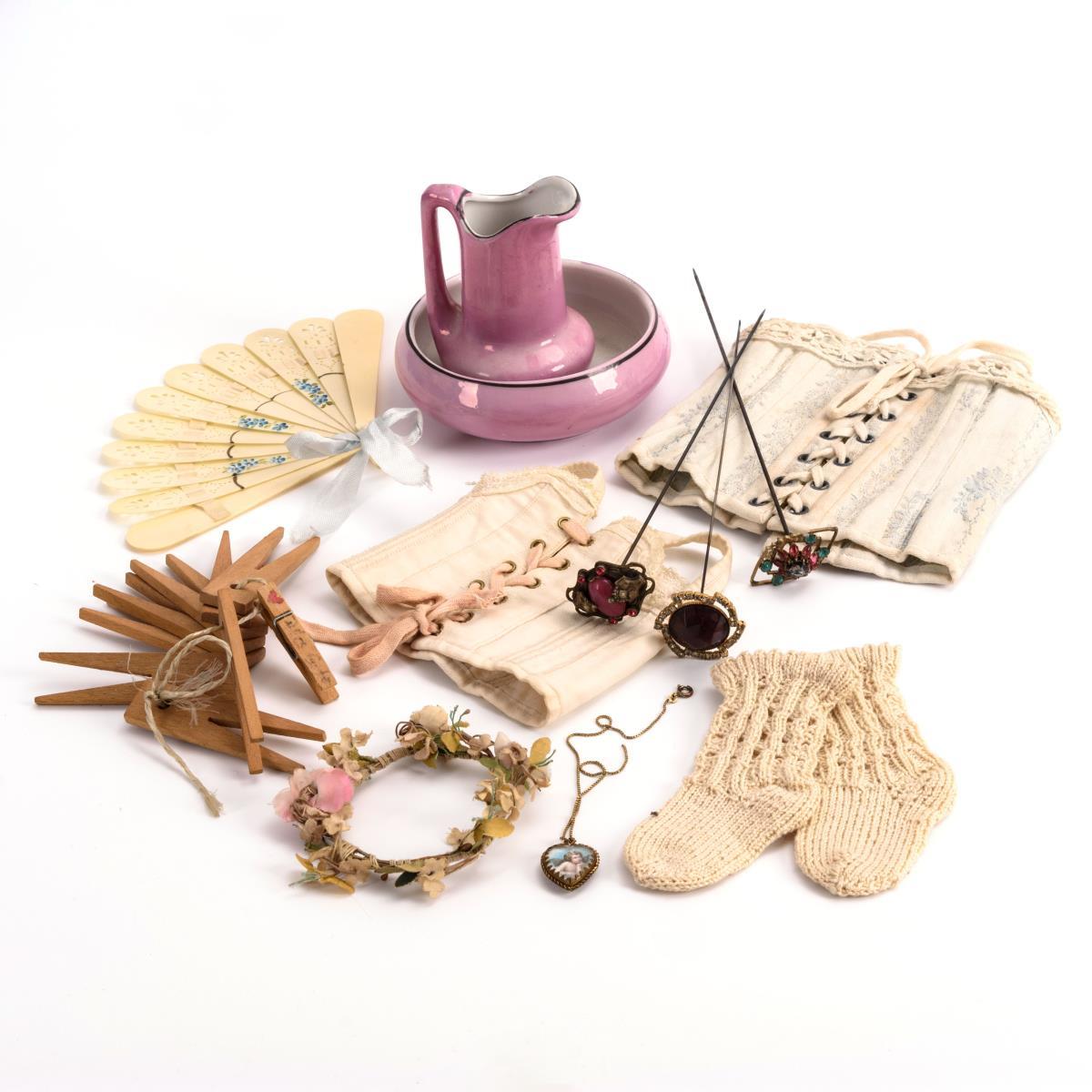 2 Puppenmieder und Zubehör für die elegante Puppendame.