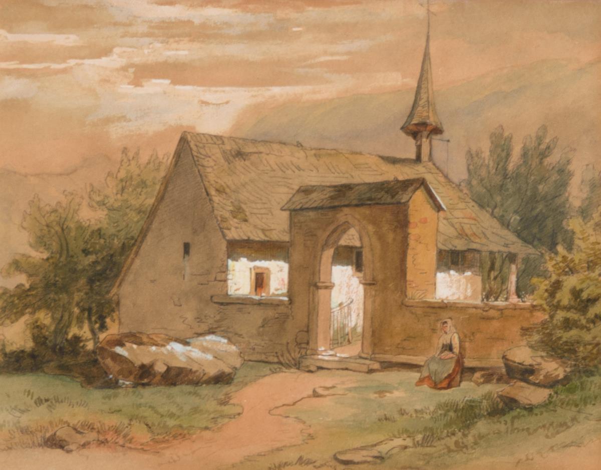 Landschaft mit Kirche und Staffage