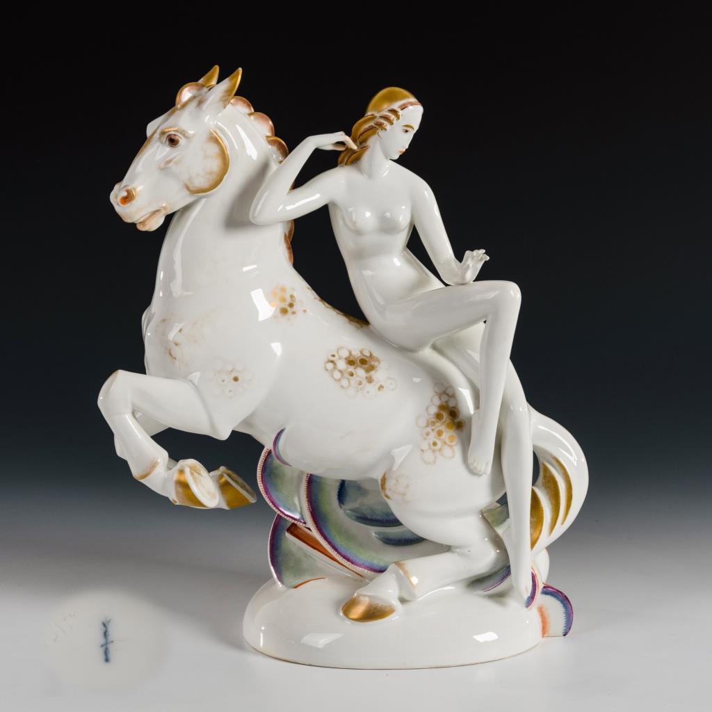 Die Figur der Levade ausführendes Pferd, auf seinem Rücken eine Amazone lagernd. Finger der linken Hand restauriert.