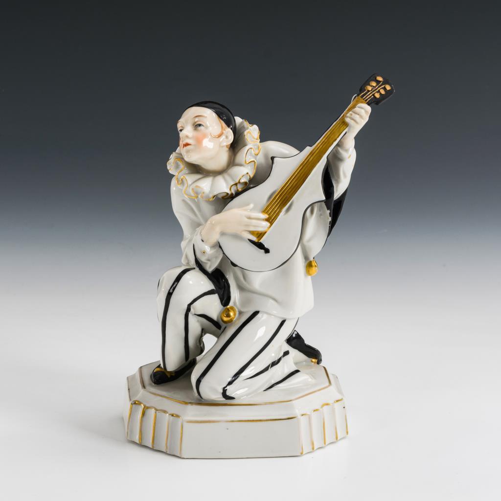 Kniender, eine Gitarre spielender Pierrot. Minimaler Goldabrieb.