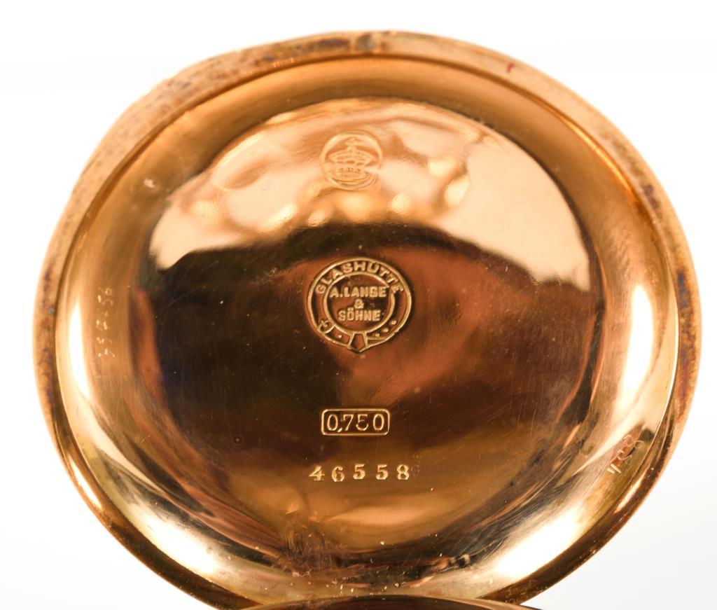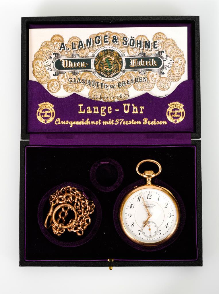 Werknummer: 46558.Gehäusenummer: 46558.19-liniges 3/4-Platinenwerk mit Ankerhemmung, Schraubenunruh, Schwanenhalsfeinreglage, gebläuter Breguet-Spirale und Schrauben, Kronenaufzug.Herstellerprägung Werk: "A. Lange & Söhne, Glashütte b. Dresden".Weißes Emailzifferblatt mit vertiefter Blattmitte, arabischen Zahlen, Minuterie, kleiner Sekunde und Louis-Quinze-Zeigern.Herstellerprägung Anzeige: "A. Lange & Söhne, Glashütte b. Dresden".