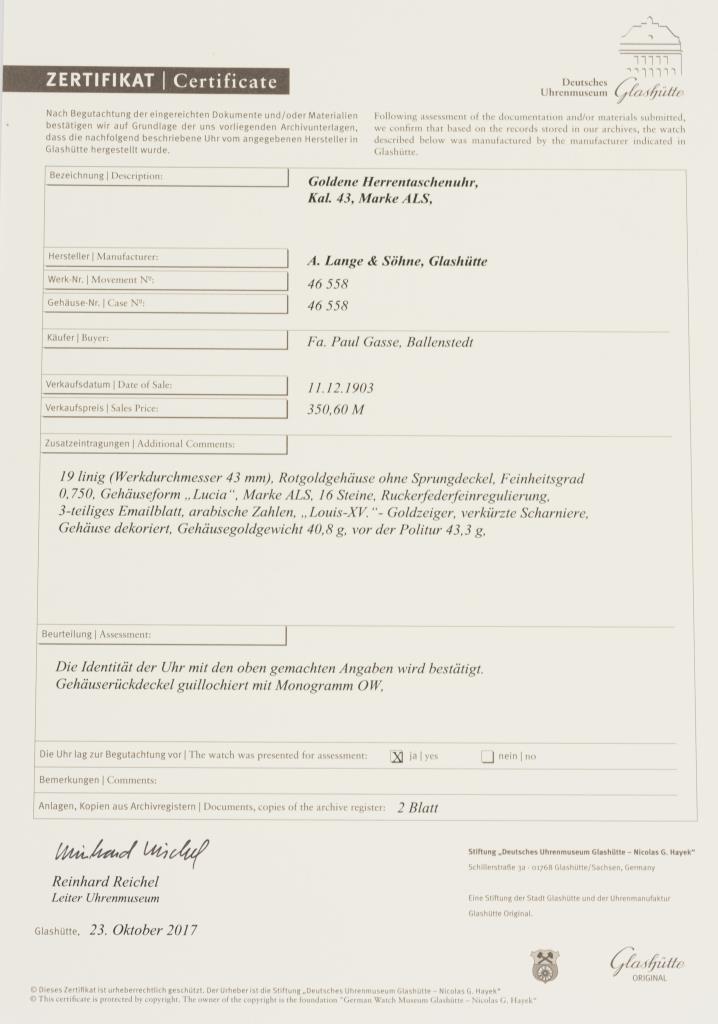 Mit ALS-Etui, Glashütte-Zertifikat und Kopien der Verkaufsbücher von 1903.