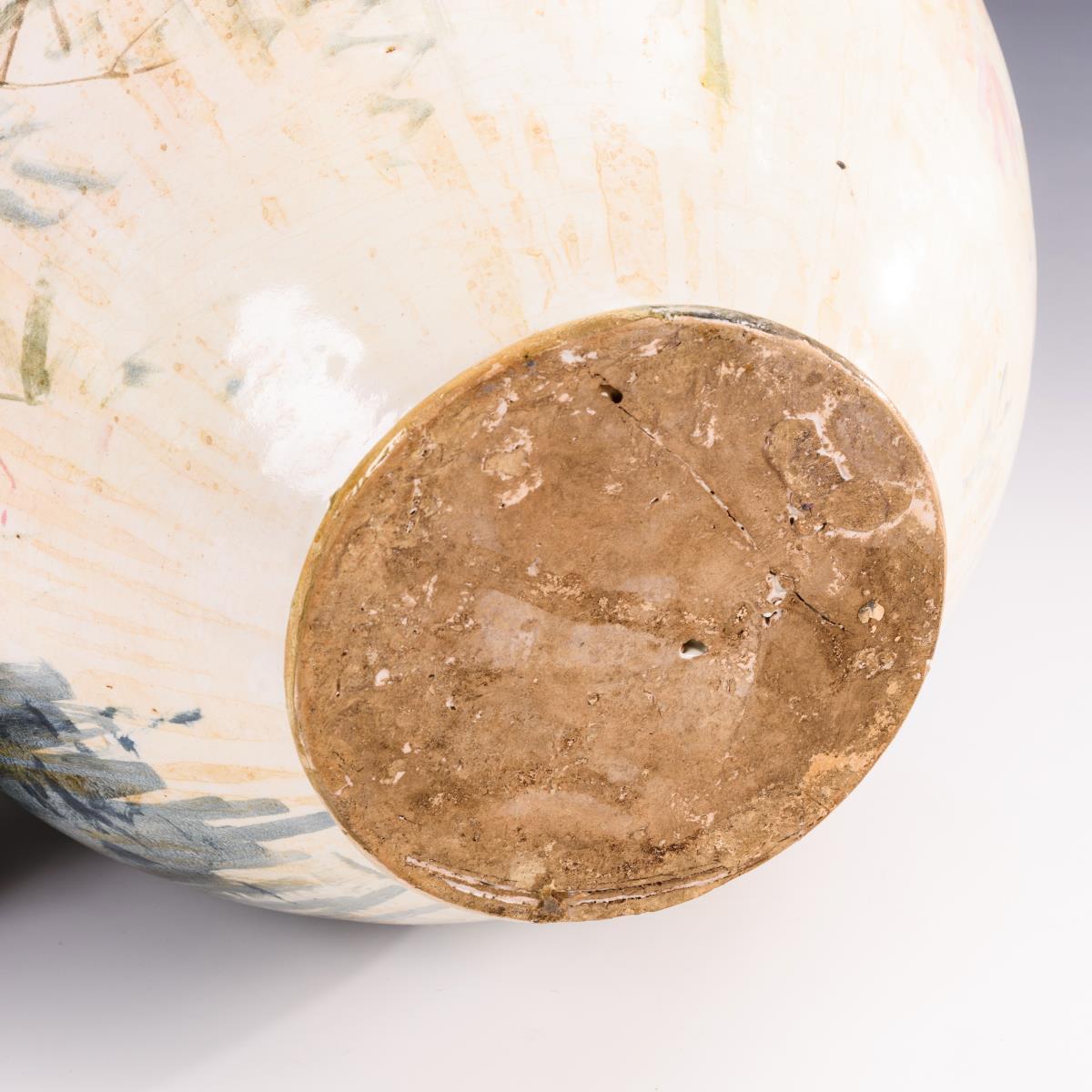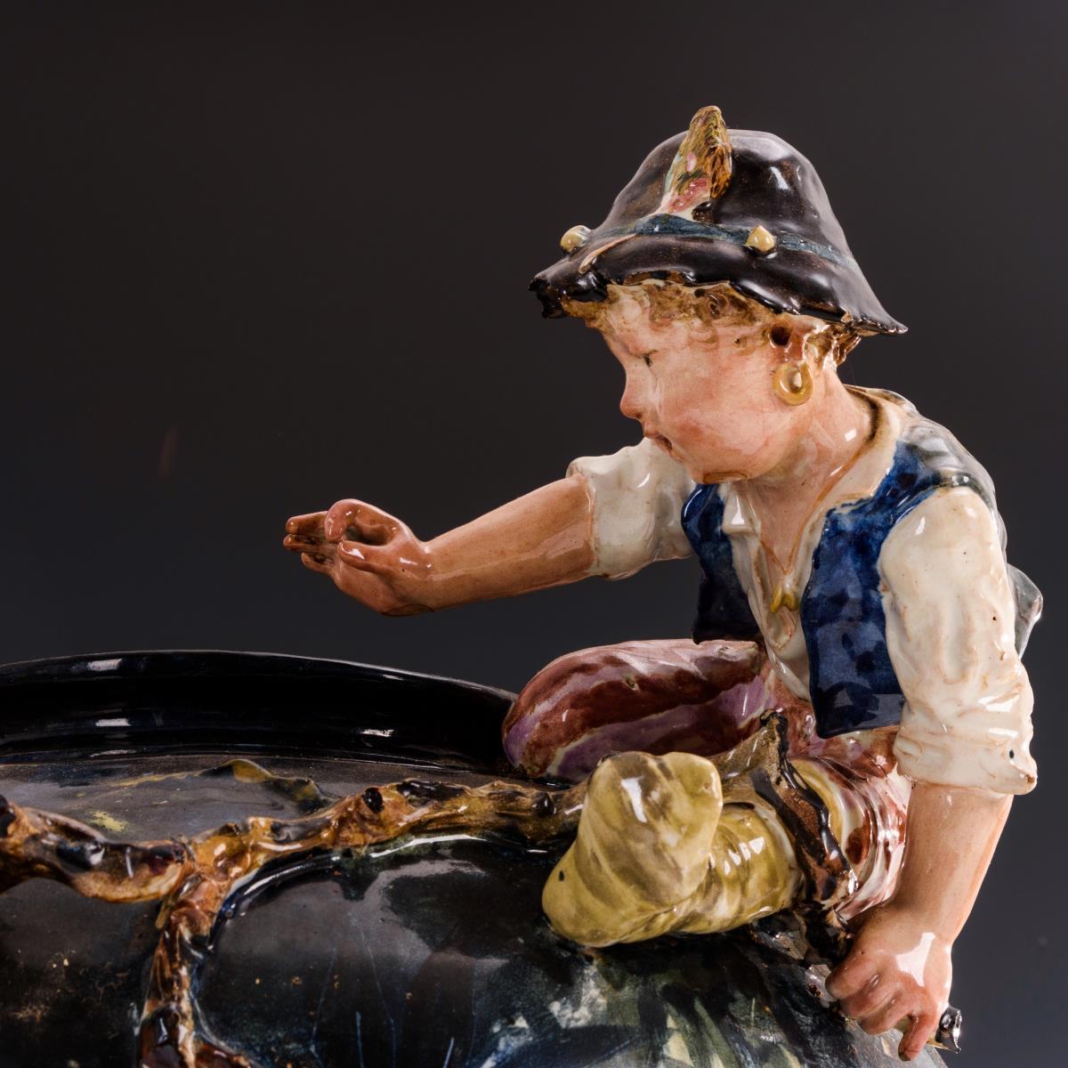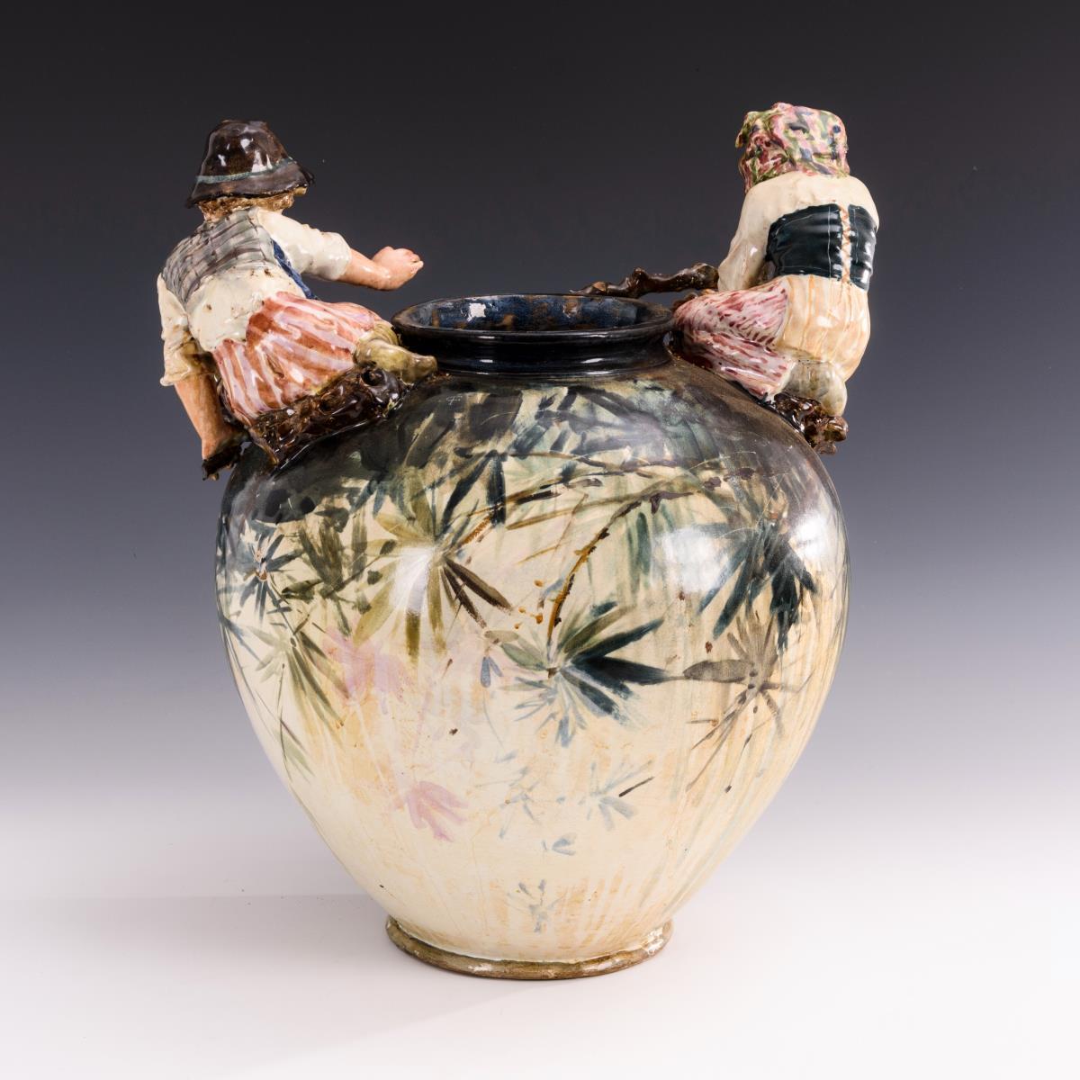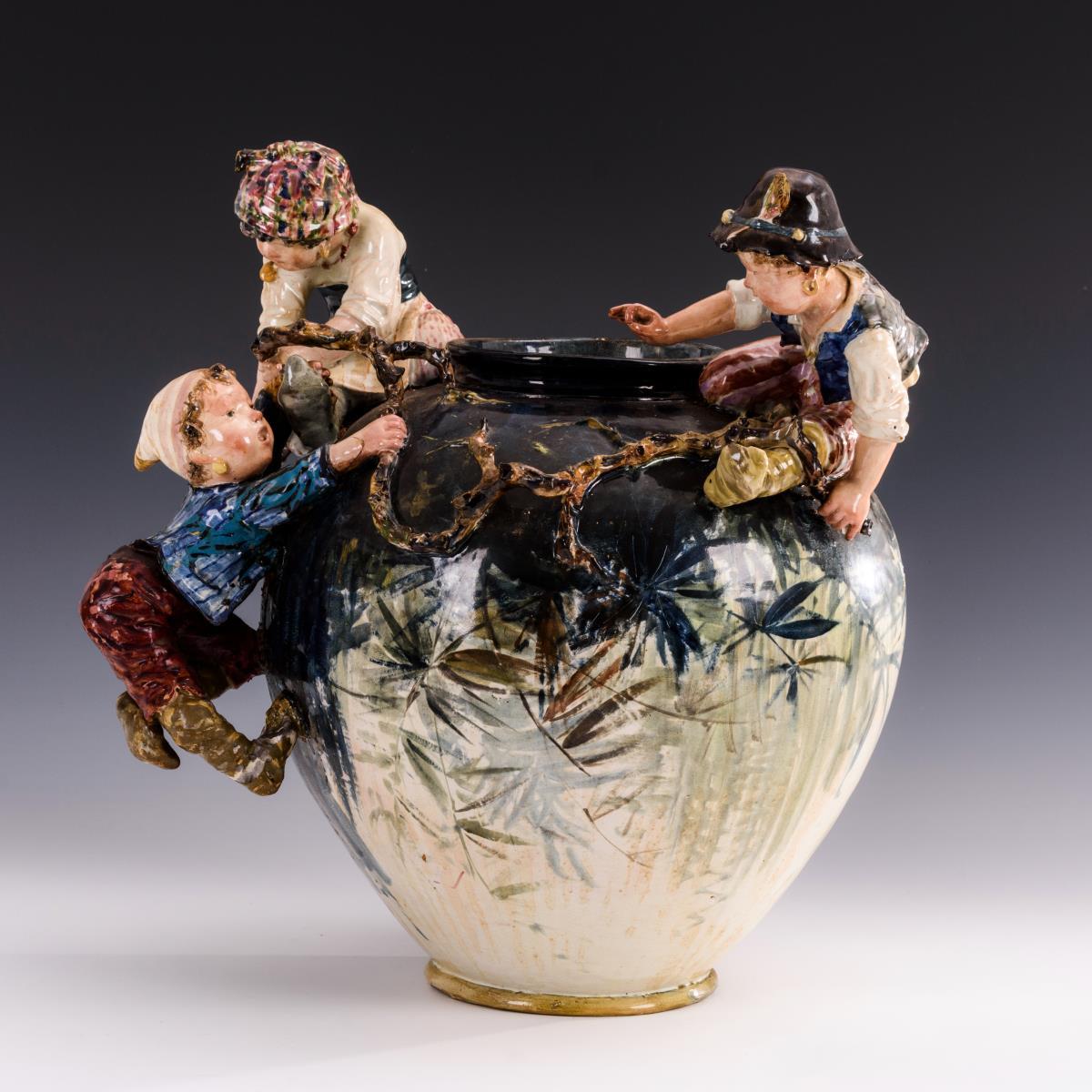 Große Majolika-Vase mit plastischen Kinderfiguren.