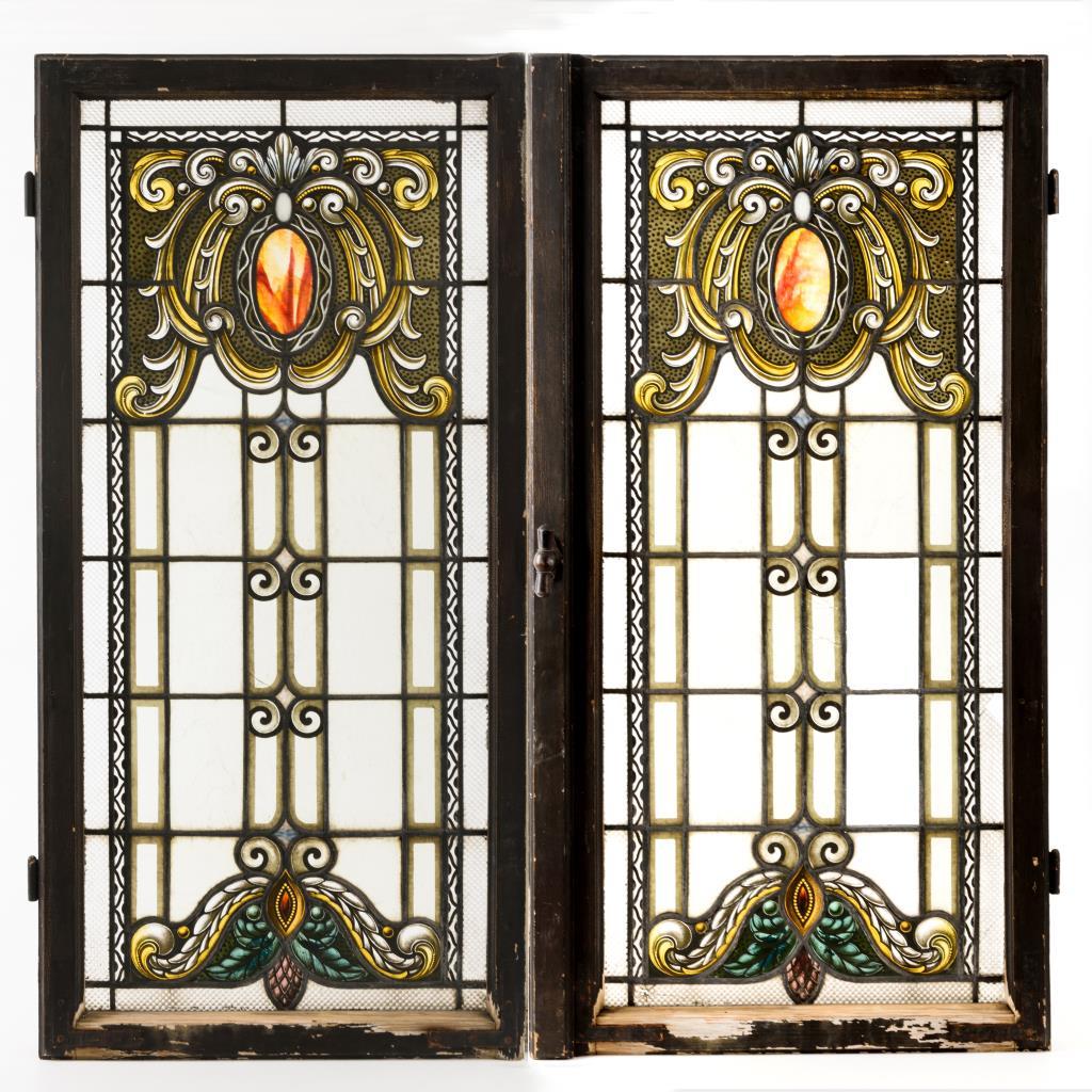 2 Fensterflügel mit Horn-Drehgriff; je mit gleichem Jugendstil-Ornament verglast. Lackschäden, 1 Flügel mit Glasdefekten, Riffelglas wohl ergänzt.