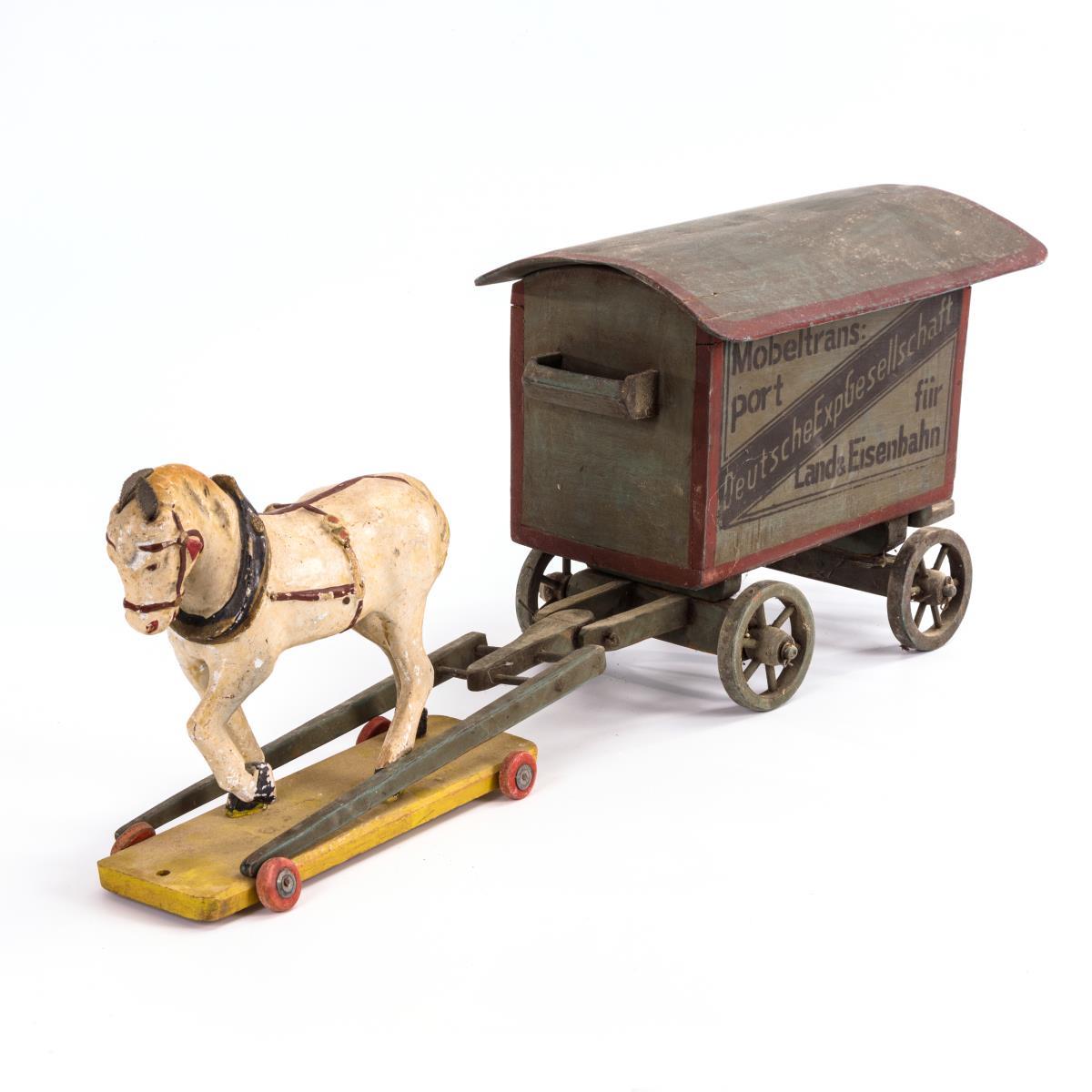 Grün gestrichener Wagen mit schablonierter Aufschrift: "Möbeltransport, Deutsche Exp Gesellschaft für Land & Eisenbahn". Dazu weißes Massepferd mit Lederohren, auf Räderplatte. Altersspuren, Pferd mit Bruchstellen an den Beinansätzen.