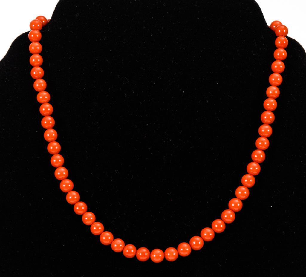 Schnürkette mit roten Korallen, an Ringfederschließe.