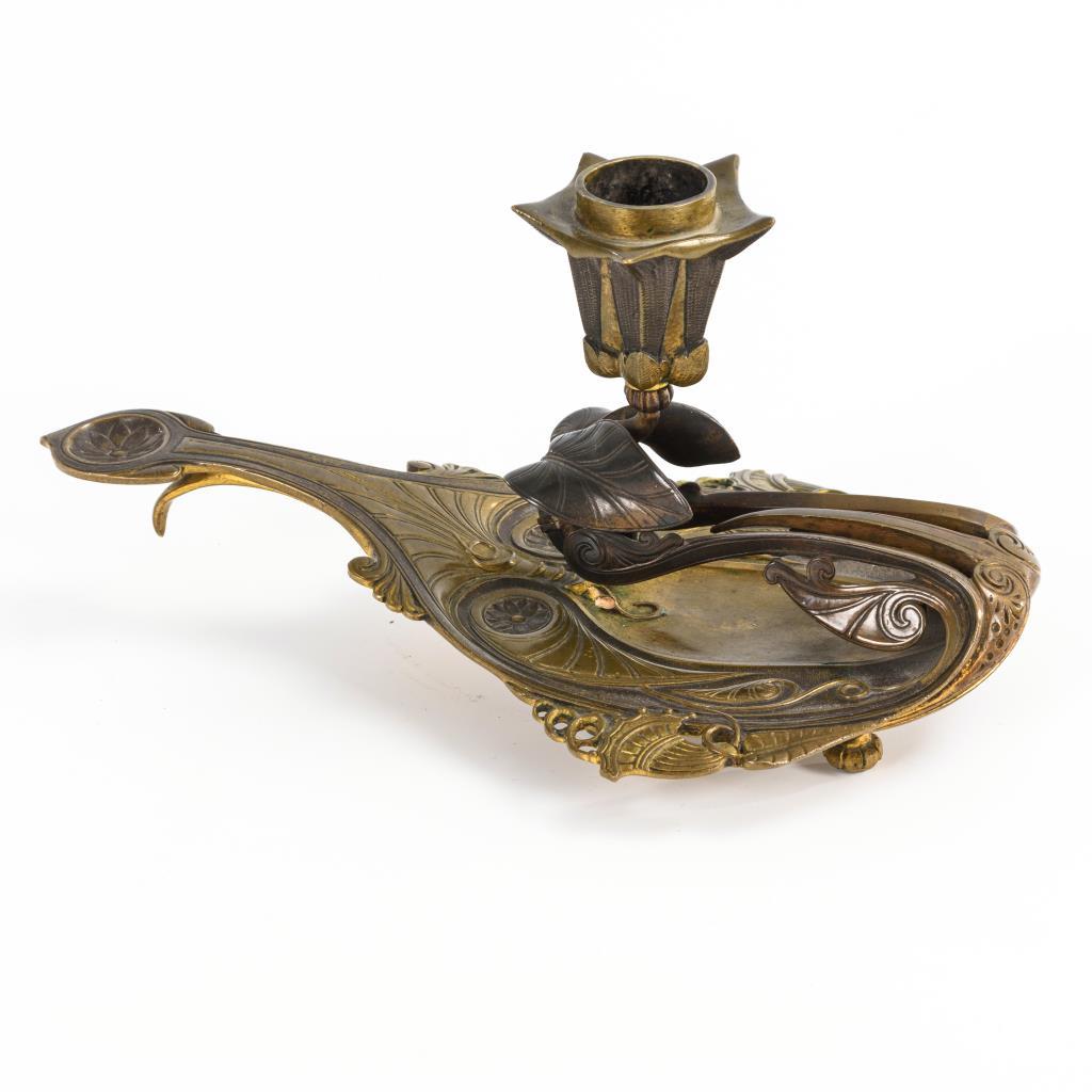 Aufwändig vegetabil reliefierter Kerzenleuchter mit querliegendem Schaft für die Knospentülle. 1 geschlossenes Bohrloch in der Bodenplatte, minimale Alters-/Gebrauchsspuren.