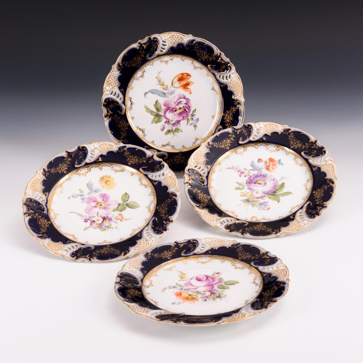 Kobaltblauer Teilfond, polychrome Blumenmalerei, Goldstaffage.