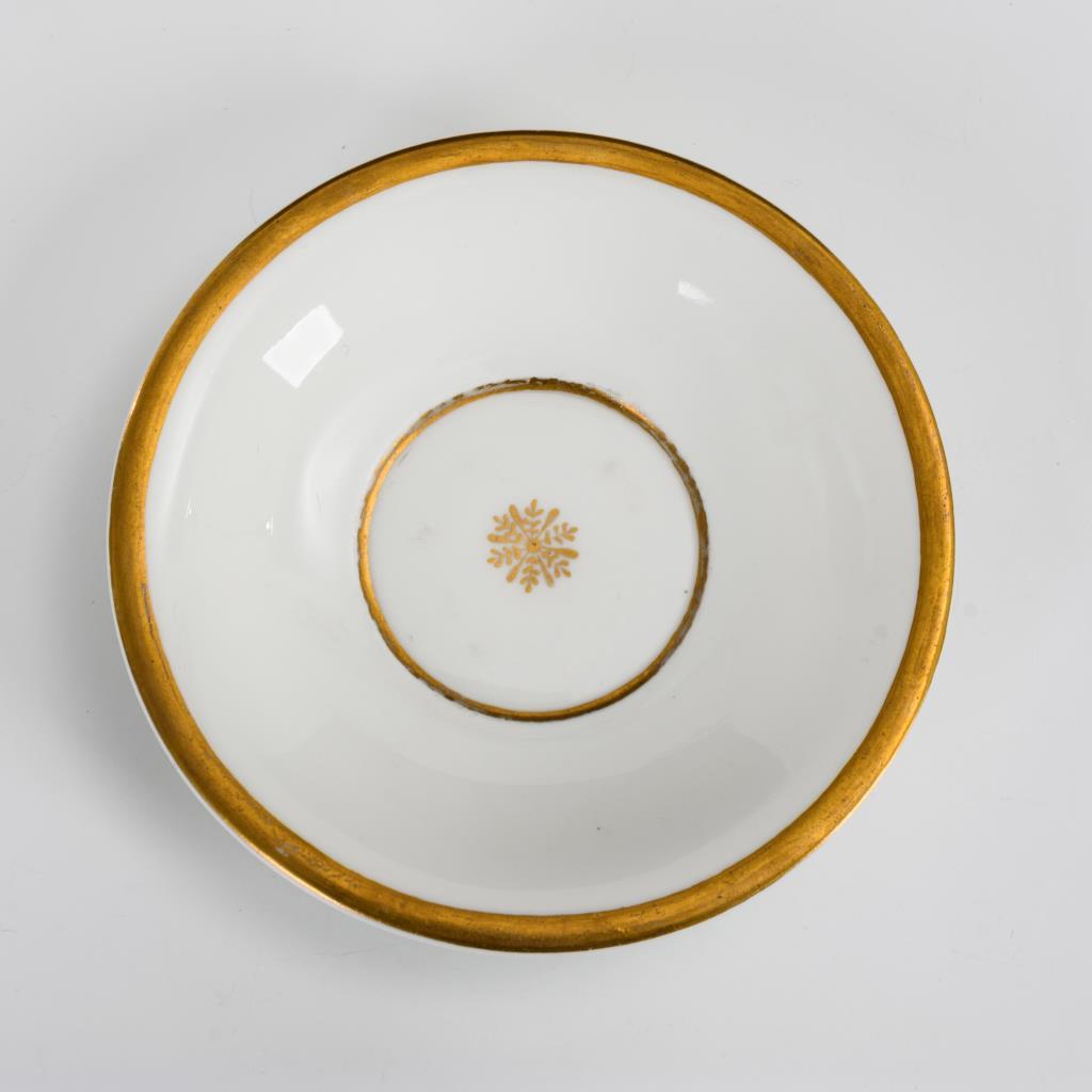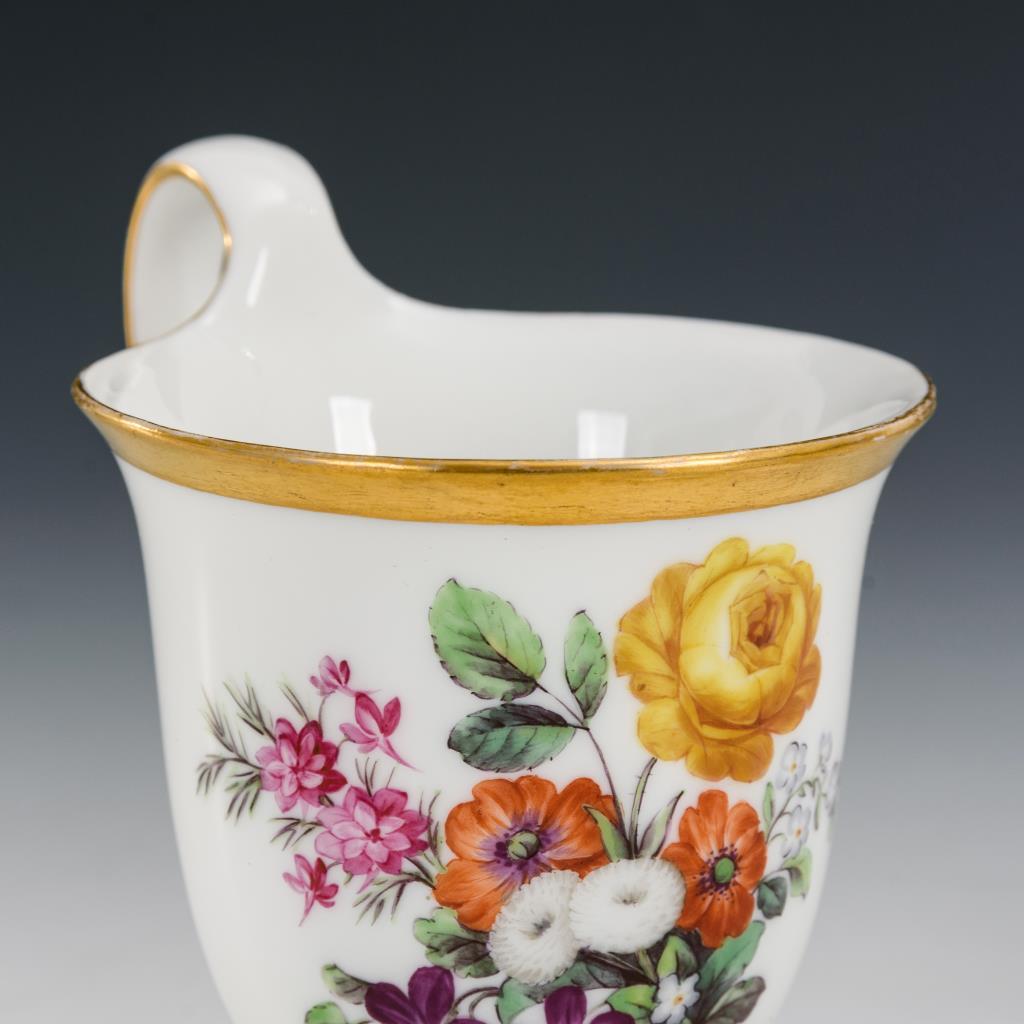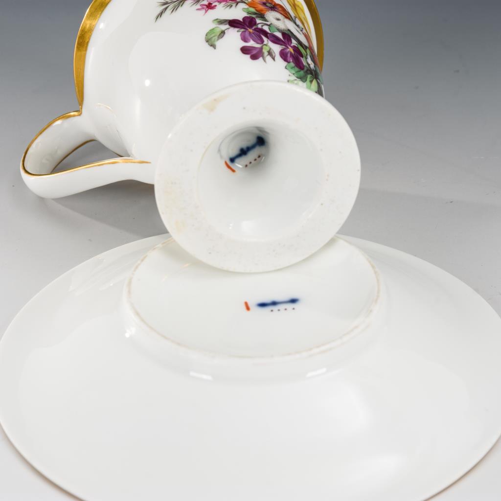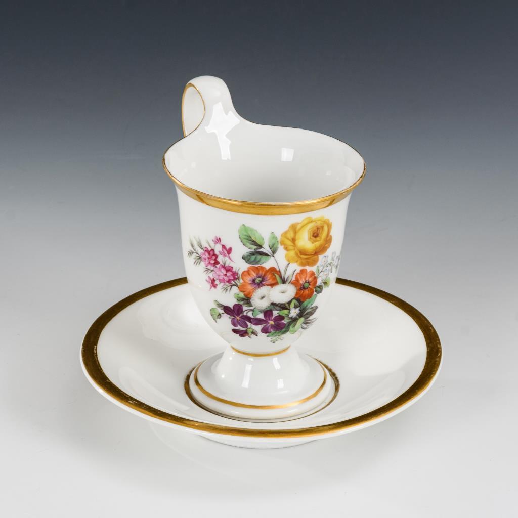 Polychrom bemalt, goldstaffiert.H Tasse 11 cm, Ø originale Untertasse 13,5 cm.