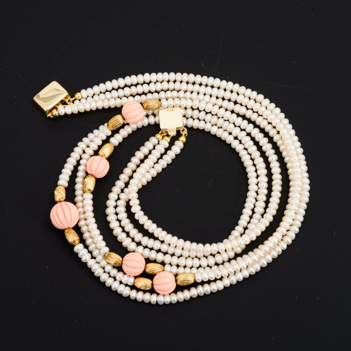 3-reihige Zuchtperlenkette mit Korallen.