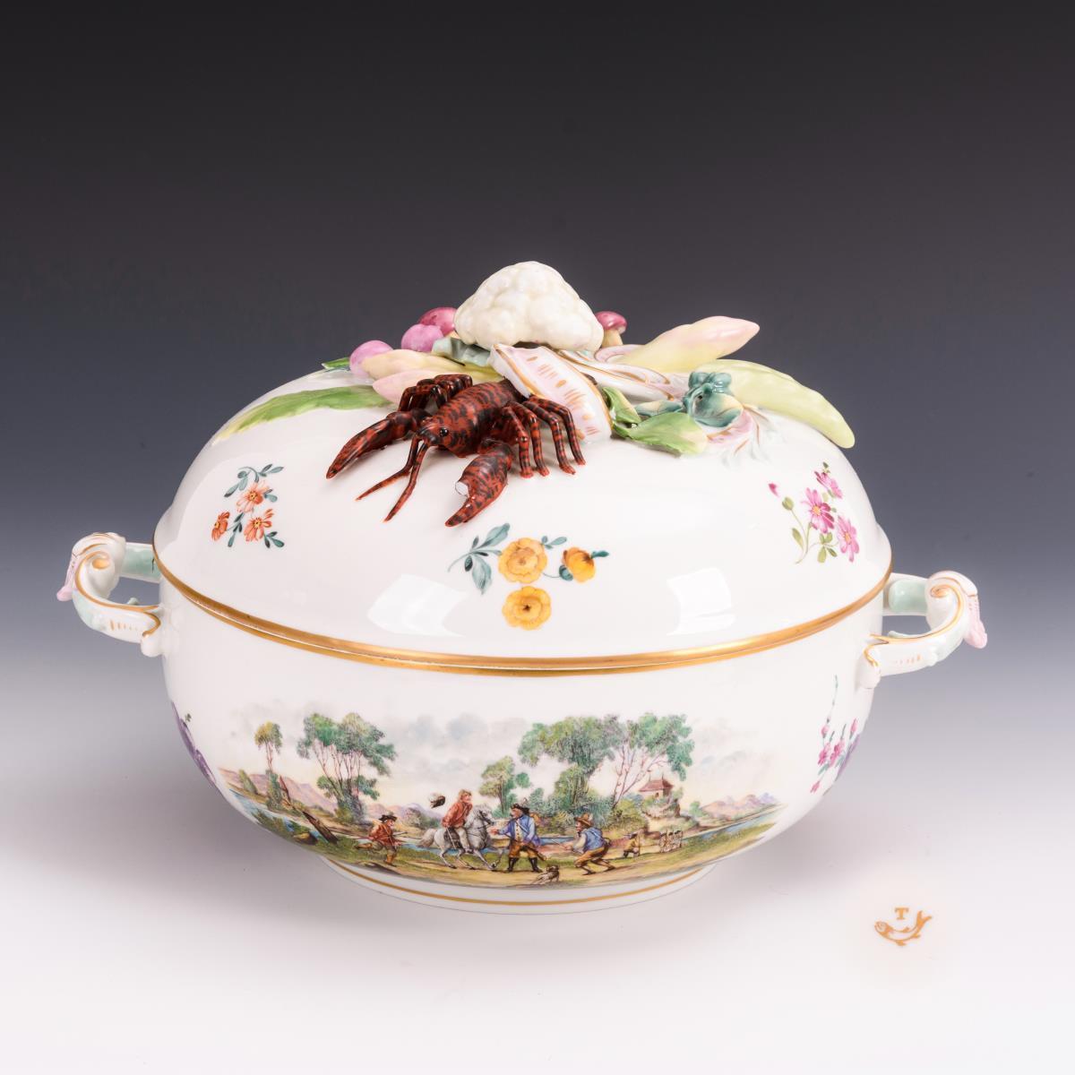 Terrine mit 2 Rocaillehenkeln und Deckel mit Gemüse- und Hummerbelag. Auf der Wandung zwei Soldatenszenen. 1 Hummerschere bestoßen..