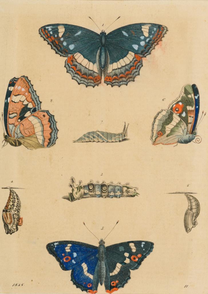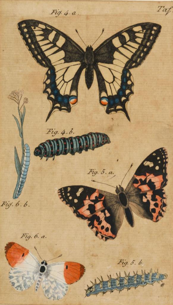 3 Abbildungen mit Schmetterlingen und Raupen, aus: Friedrich Justin Bertuchs Bilderbuch für Kinder, um 1800. Beschnitten, etwas stockfleckig.
