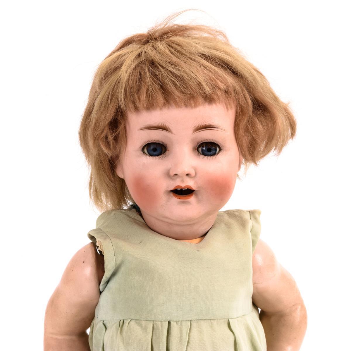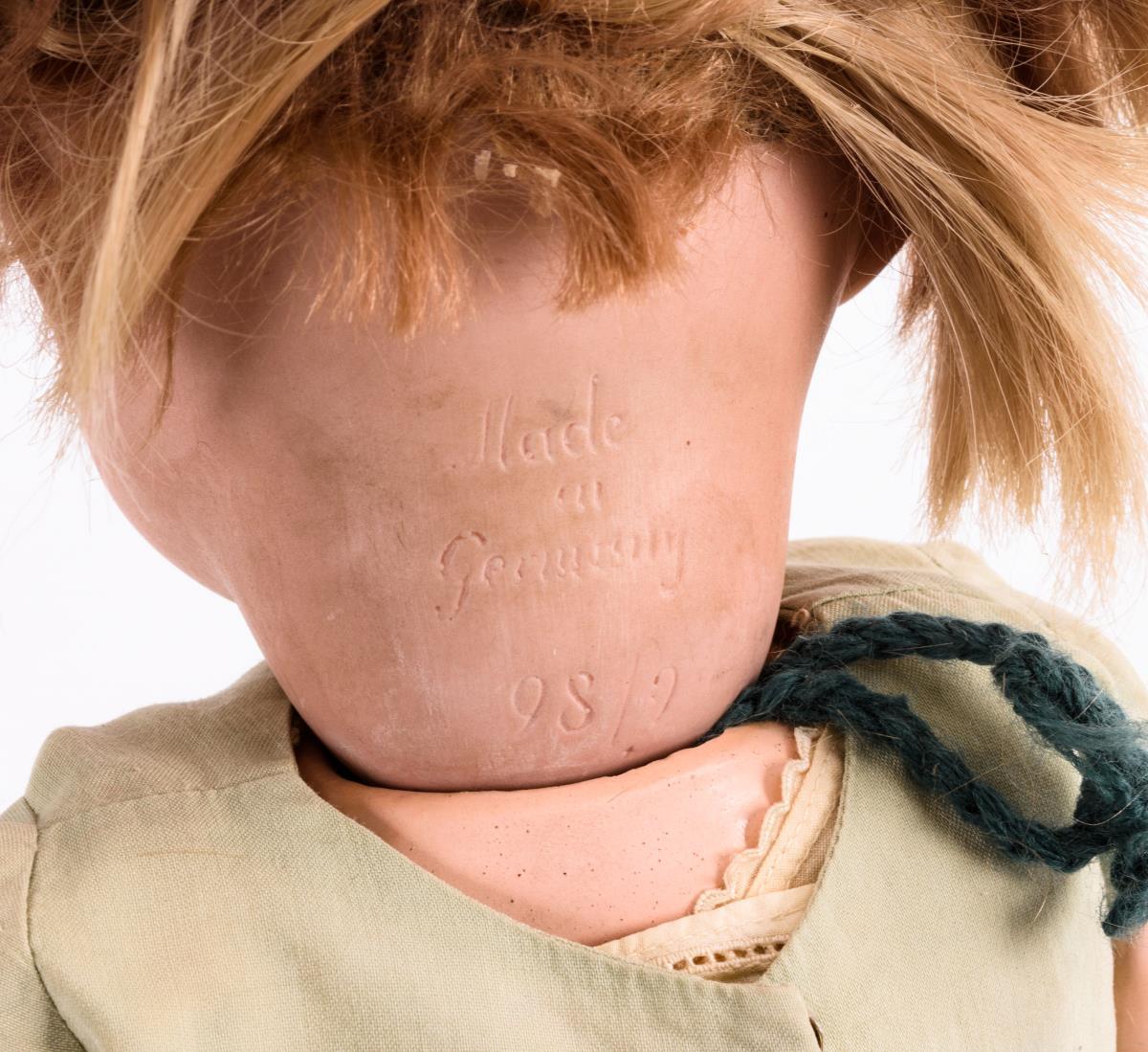 Perücke fest verklebt, Kopf nicht durchleuchtet, jedoch ohne sichtbare Defekte. Arme lose gespannt.
