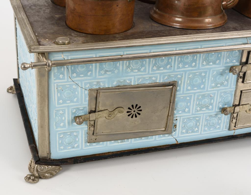 Hellblauer Korpus, 3 Ofentüren, 5 Kochstellen, gegossene Klauenfüße. Dazu 5 originale Kupfertöpfe, 4x Email und 1 "Kochbüchlein für die Puppenküche oder erste Anweisung zur Bereitung von süßen Speisen, Backwerk und warmen Getränken", Nürnberg 1859. Herdfront mit Haarrissen. Altersspuren, Kochgeschirr teils gebeult, Deckel und Henkel des Kessels fehlend.