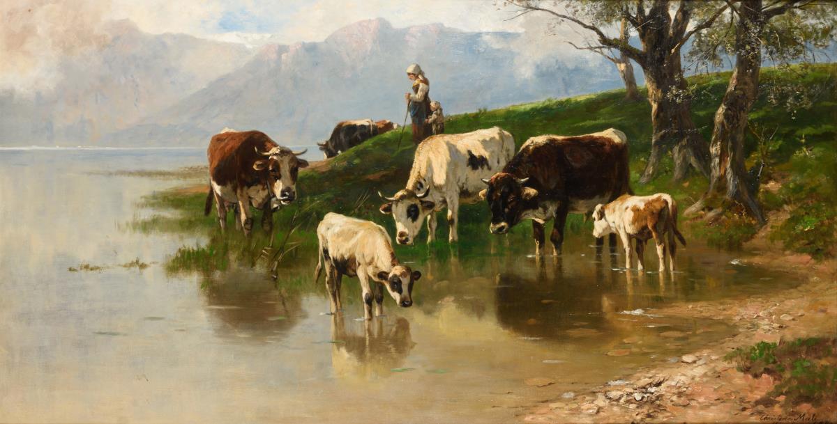 Großes Gemälde Kühe und Hirtin mit Kind am Bergsee.