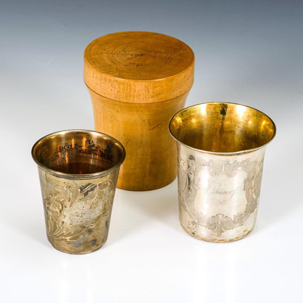2 gravierte Becher, 1x "L. Scharf 30", 1x mit ungravierter Kartusche. In Etui mit Deckelgravur "Ludwig Scharf 30". Gebrauchsspuren, 1x Boden repariert.