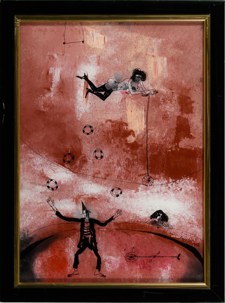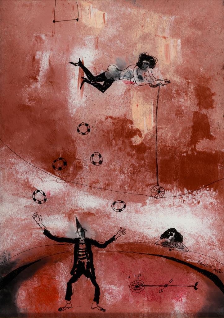 Die Artisten in der Manege beim Jonglieren und auf dem Hochseil balancieren.