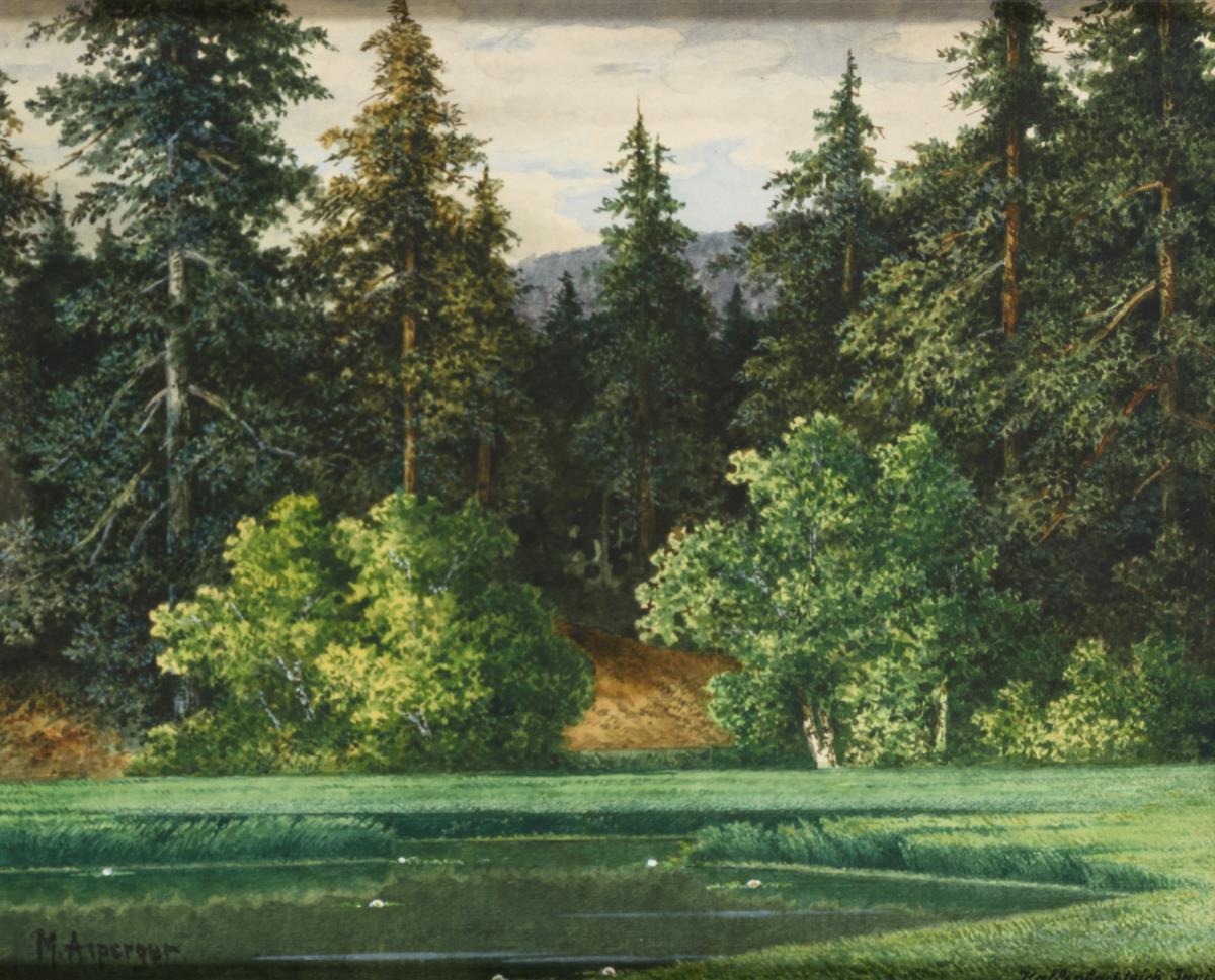ASPERGER, Max (1864 Apolda - 1924 Gotha) Thüringer Landschaft ("Kallenbachteich") Aquarell. Links unten signiert, rechts unten Ortsangabe mit Datum. 23 x 29 cm. Gerahmt & hinter Glas: 37 x 43 cm. Von hohen Bäumen umstandenes Ufer mit Schilf. Landschaftsmaler und Radierer in Weimar und Gotha, studierte in Weimar bei Hagen. Literatur: Thieme/Becker..