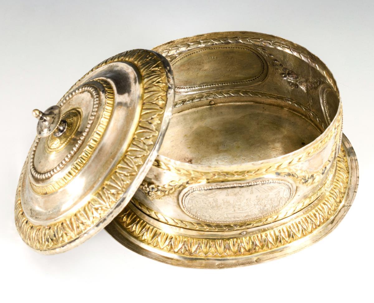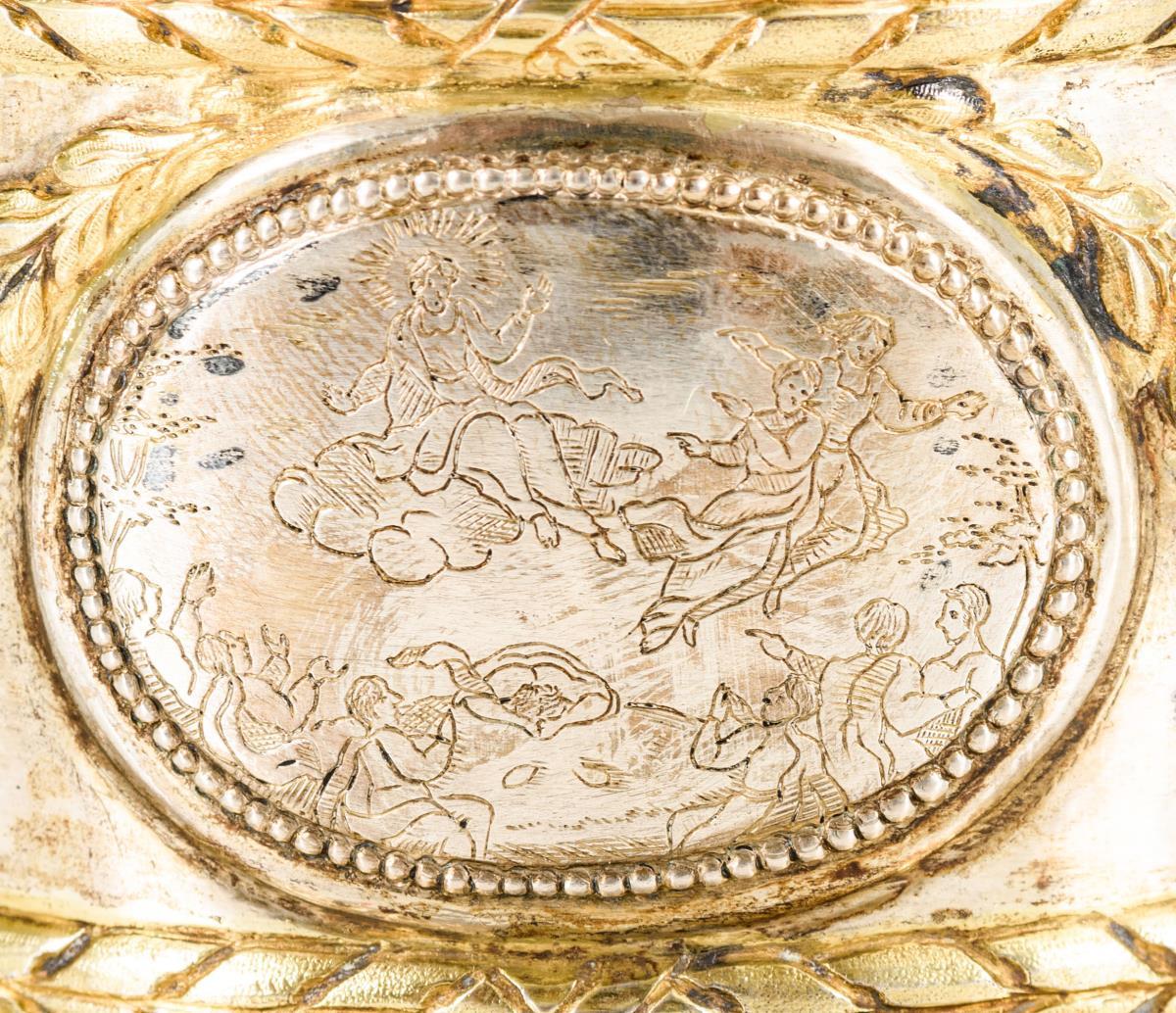 Inschrift berieben, Deckel mit Randdefekt, kleine Lötstellen.