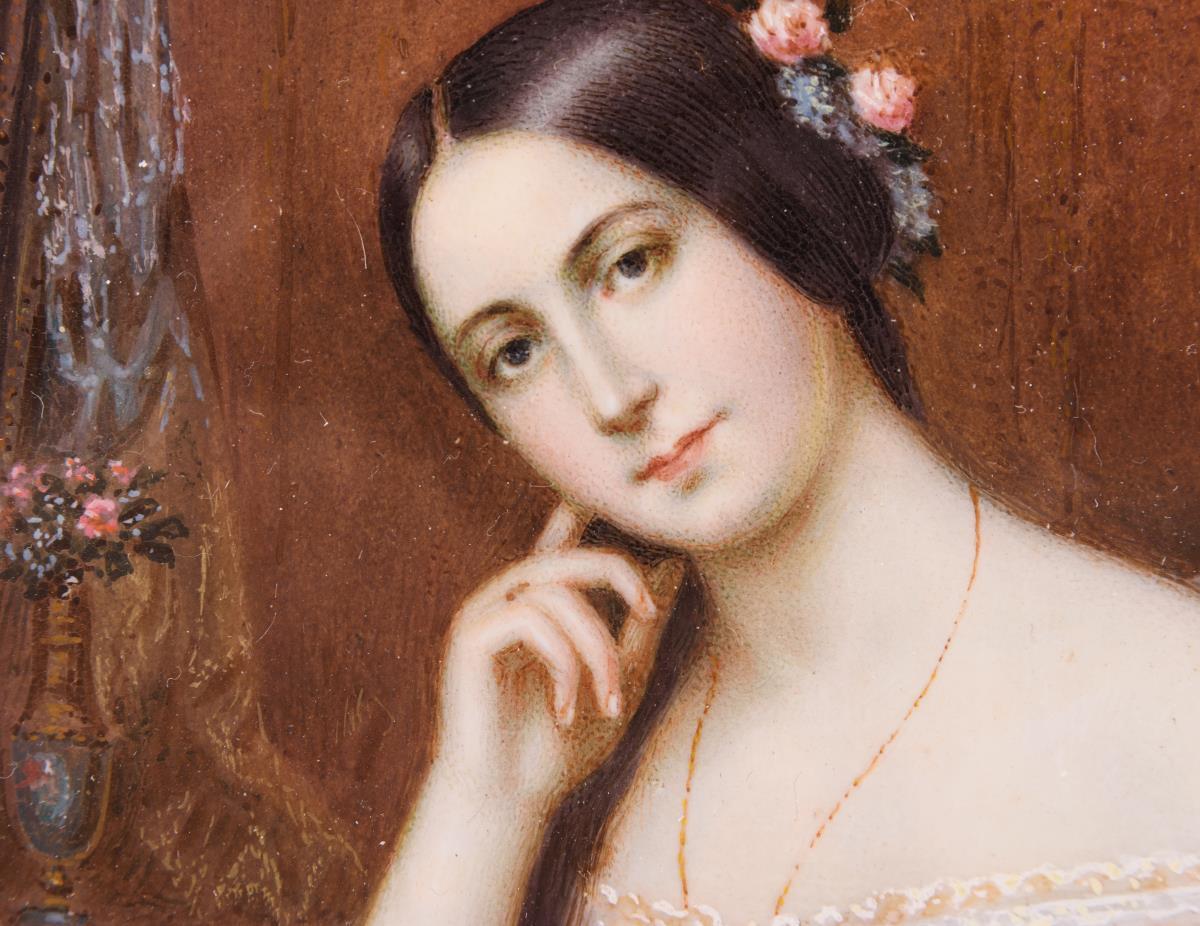 Tempera/Elfenbein, verglaster Messingrahmen mit Aufsteller.