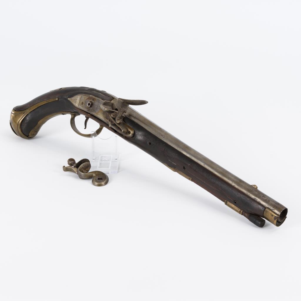 8-kantiger, in rund übergehender Lauf mit Messingkorn, Kaliber 18 mm. Leicht beschnitzter Holzschaft mit Messing-Montierungen. Ladestock ergänzt, Schraube Schnapphahn fehlt. Wohl aus alten Teilen zusammengebaut.