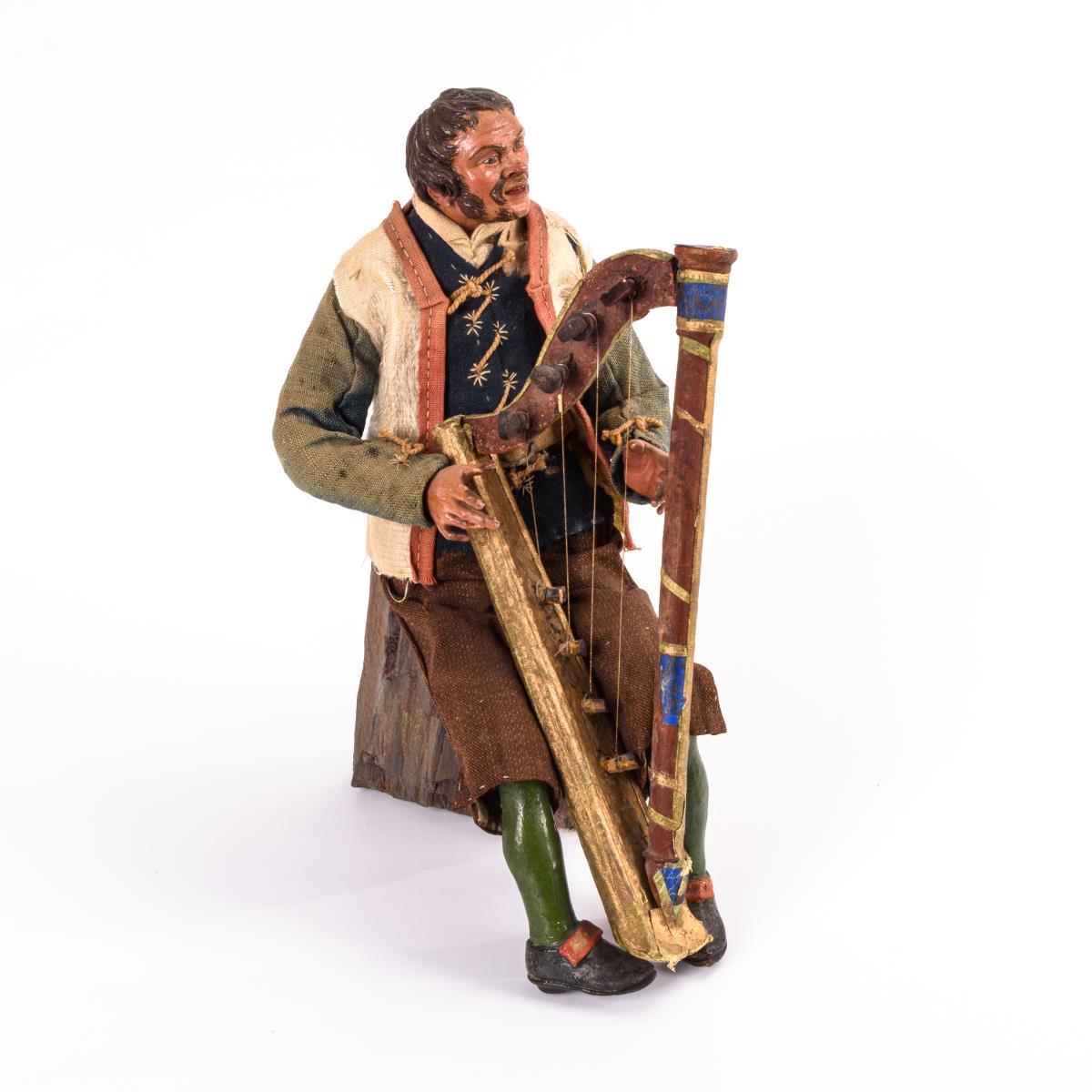Neapolitanische Krippenfigur: Sitzender Mann mit Harfe.