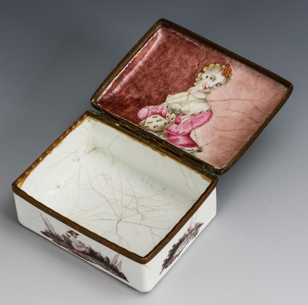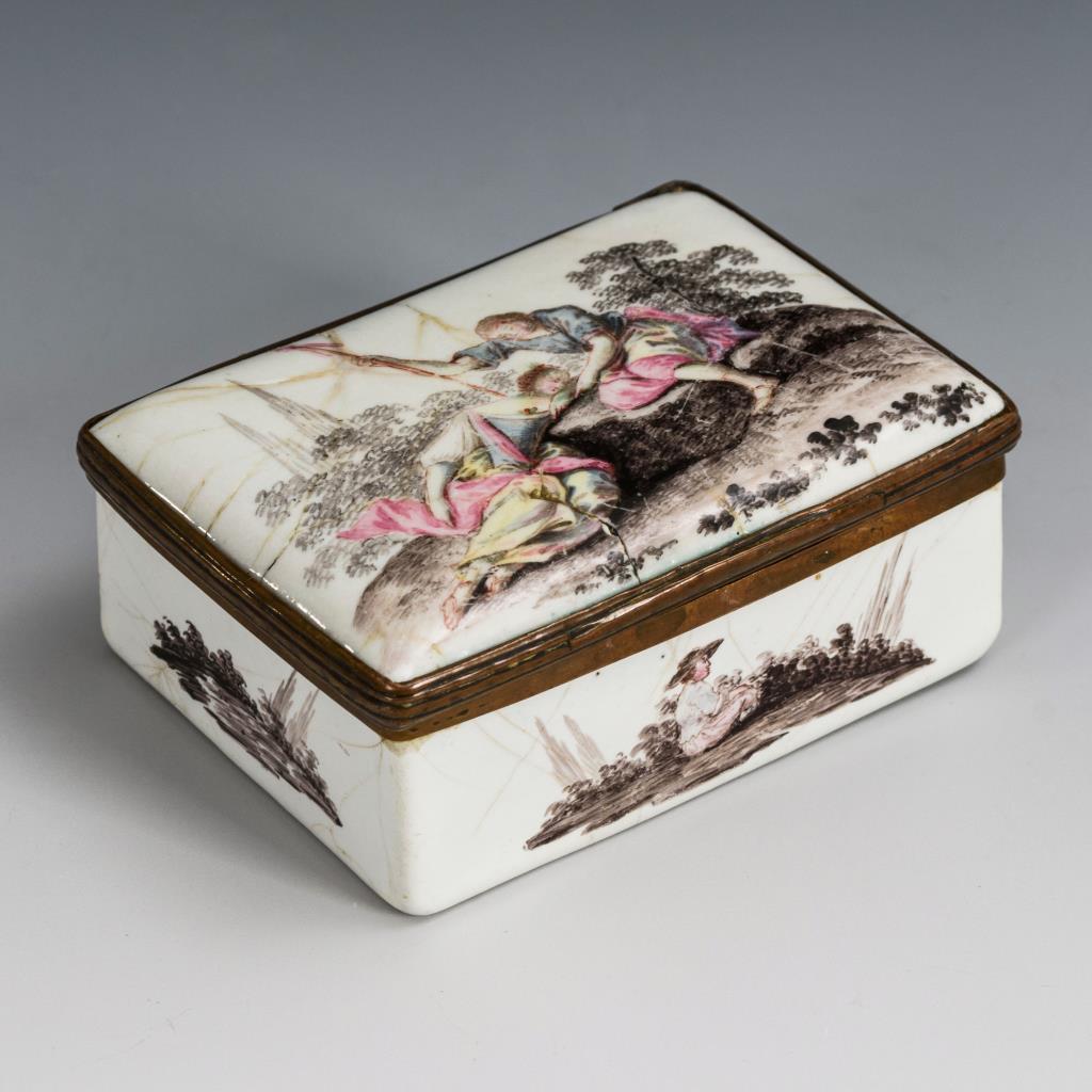 Allseits und auf dem Boden bemalte Quaderdose mit Schäferszene auf dem Deckel sowie Porträt im Deckel. Haarrissig, kleinere Defekte und Reparatur an der Montierung.