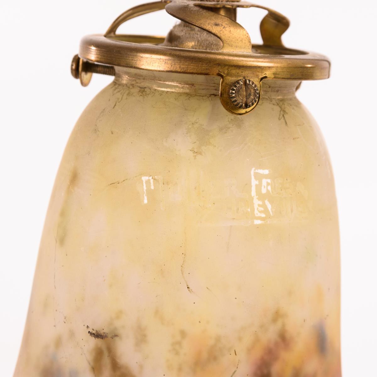Farbloses, mattiertes Glas mit blauen, opalweißen, orangen und braunen Pulvereinschmelzungen; Bronze.